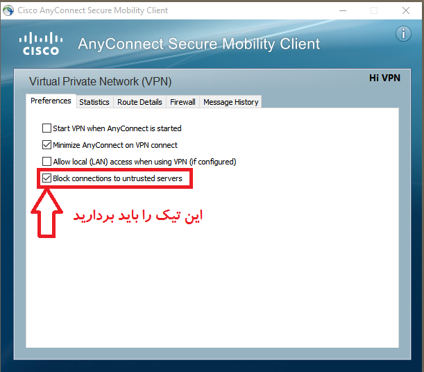 4- تیک گزینه آخر را بردارید “Block connections to untrusted servers” و پنجره را ببندید