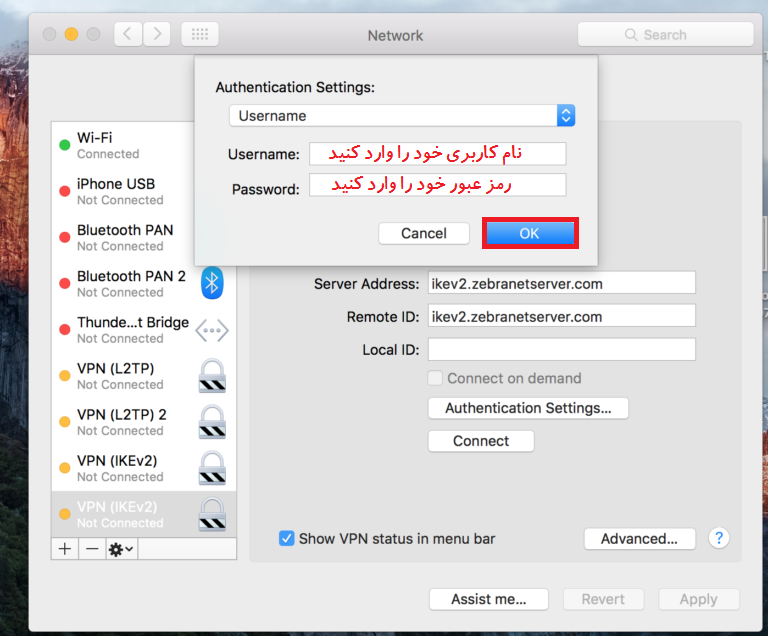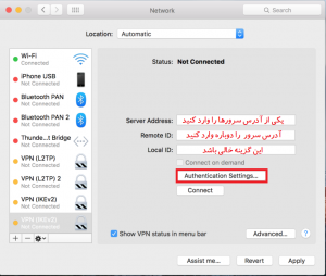 5- یکی از آدرس سرورهای زیر را وارد کنید و سپس روی گزینه Authentication Settings کلیک کنید